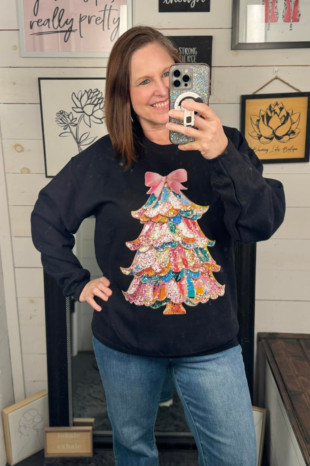 Wrap yourself in holiday cheer with this cozy black crewneck sweatshirt featuring a whimsical vintage-inspired Christmas tree adorned with colorful bows. Perfect for festive gatherings, casual winter days, or anyone who loves a touch of nostalgic charm. The soft fabric keeps you comfortable while the eye-catching design spreads seasonal joy wherever you go. A playful wardrobe essential that brings retro holiday vibes to life.