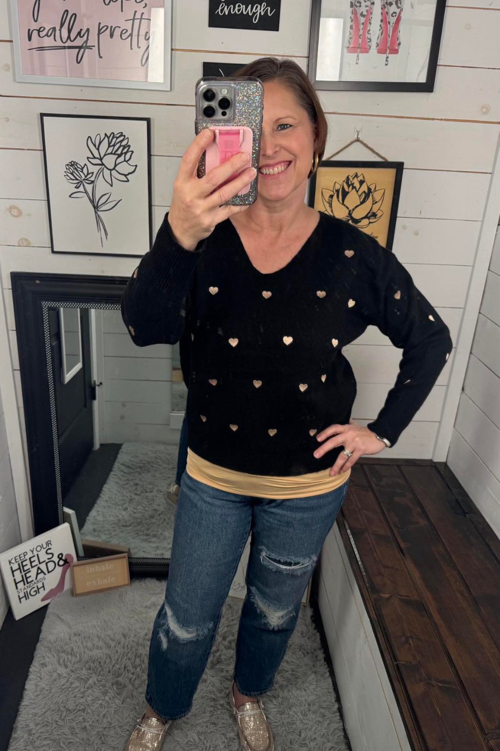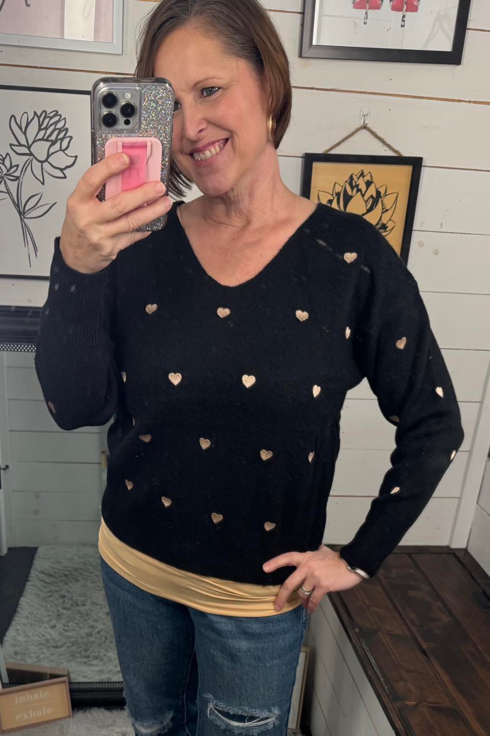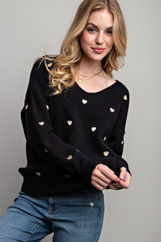 Add some love to your winter wardrobe with our Isabella Heart Pattern Sweater. This knit pullover features adorable embroidery heart shapes on a boxy fit silhouette. Stay cozy and stylish in this black sweater adorned with tiny white hearts.