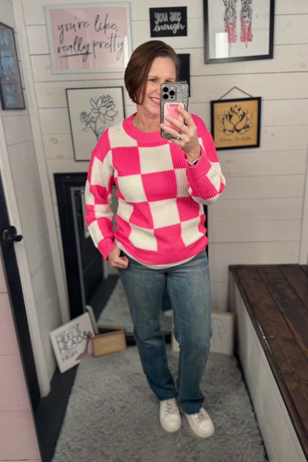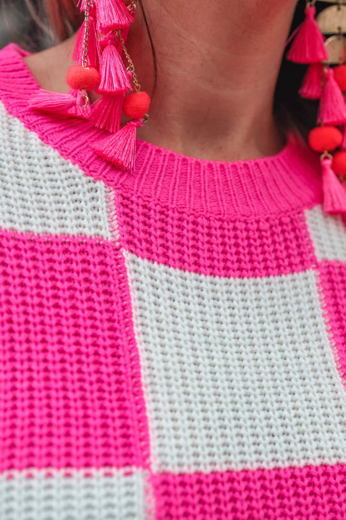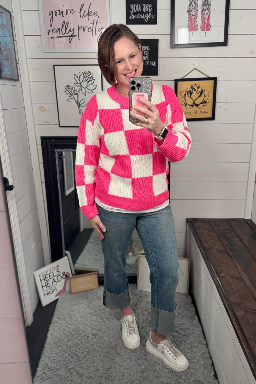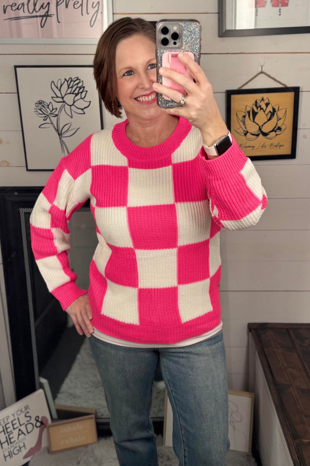 Stay on trend with our Paisley Checkered Sweater! This trendy knit sweater features a fun and stylish checkered pattern that is perfect for any occasion. Stay cozy and fashionable all year long with our Paisley Checkered Sweater.